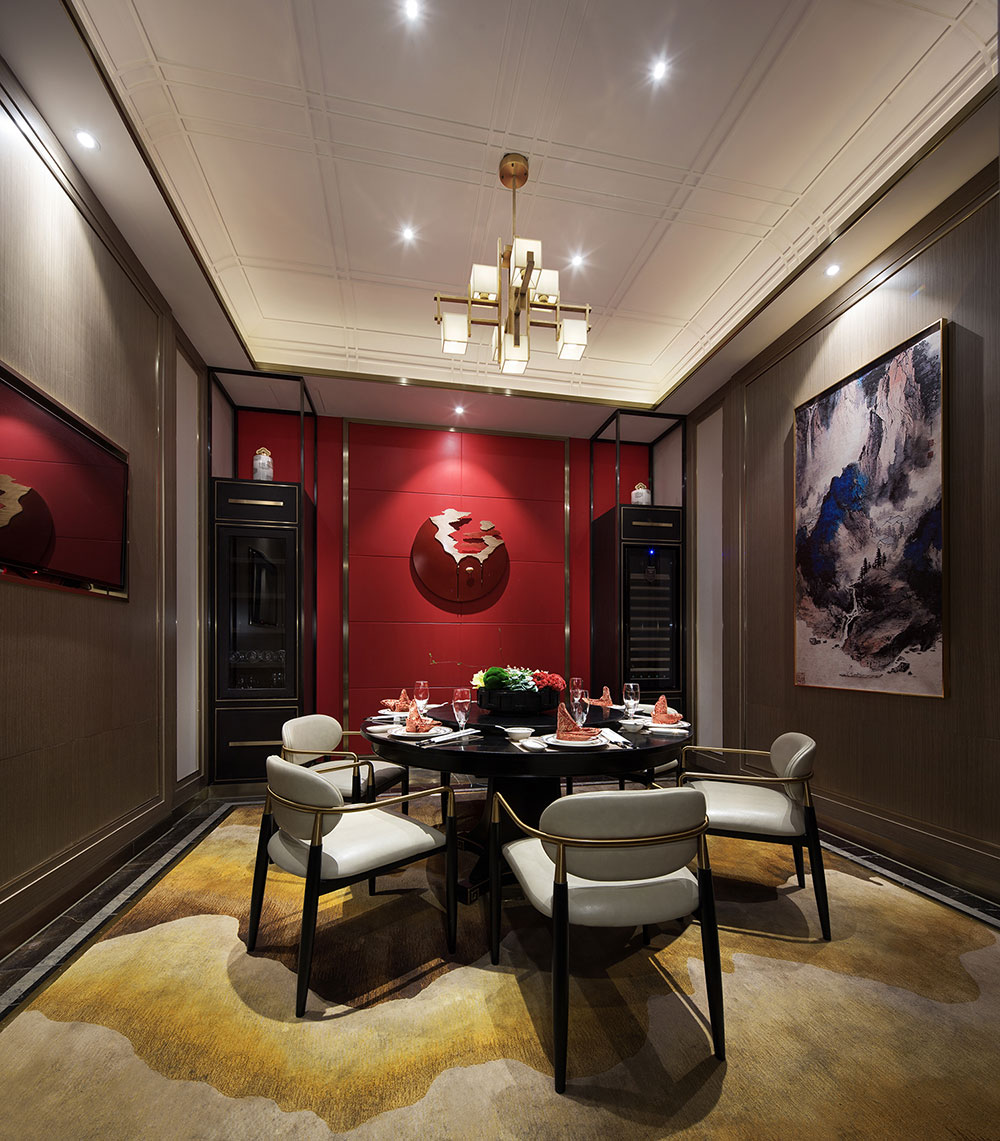 餐廳以一種做客式的空間形成方式,將顧客引入極致韻味的用餐氛圍中。喜粵薈餐廳設計將優雅與舒適融為一身,個性化定制的家具與室內陳列的中國水墨畫作,皆為包房內增添了東方色彩。設計師用隱喻的手法將具有中國特色元素的掛畫、燈籠、水墨畫等融入整個設計中,讓人不經意間就能發現隱匿于空間中的東方情懷;再次,運用精美的裝飾品以及新中式燈飾,營造出高雅的藝術氛圍。最后,紅色材料在空間靈活跳躍著,一改暖灰色調中安靜沉穩的模樣,使空間流溢著喜慶,也讓喜粵薈餐廳增添一份靈動,采用柔和的暖光源,使空間變的通透而開闊,溫和而舒適。 在這里用餐,食客會被濃烈而又愜意氛圍所感染,猶如置身于一幅東方色彩的畫卷中,連每一道菜都成了藝術品。