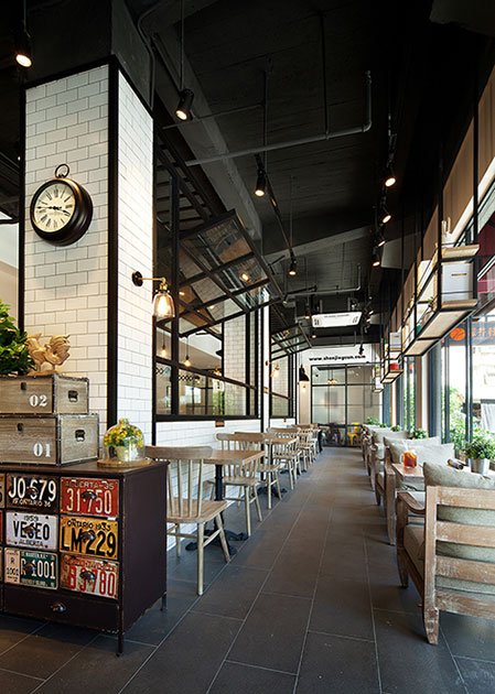 ??深井村西湖店餐廳整個餐廳設計空間大方、簡潔利索,一道半封閉、通透碩大的黑色邊框窗戶隔斷將其分為兩個部分,同時又將兩相對獨立的空間有機連接在一起。半封閉的隔斷設計顯得十分有意思,活動的窗戶象是自然打開,窗框的邊緣上懸掛著幾盞鎢絲燈,使得整個空間格外具有工業風的氣息。墻面潔白的瓷磚,墻角的黑鏡鋼鑲邊,形成黑白鮮明對比,使得空間簡潔時尚。柱子上方懸掛的圓形黑面時鐘與下面矮柜上擺放的仿舊車牌裝飾,均個性十足,充滿著新奇與趣味。