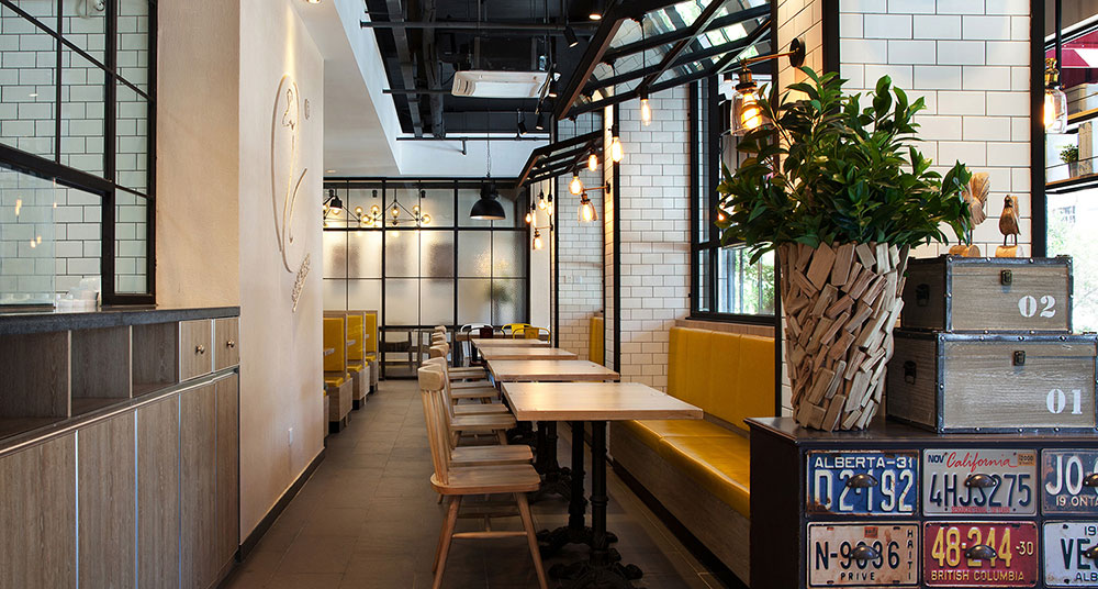 ??外墻靠窗部分的就餐區,光線充足,座位上方利用空間制作的具有工業風格的黑色鋼質吊架里面,擺放著各式各樣精心挑選的裝飾品,起著美化就餐環境的作用。而靠內墻的就餐區域則更具特色,四人雅座采用光鮮明亮的橙黃色,墻面上配有可伸縮的壁燈,燈下方則裝飾著具藝術氣息的插畫,盡顯高雅格調。為了最大限度地利用空間,各個就餐區域均盡可能地井然有序擺滿座位,而多樣化的座椅樣式,有做舊的鐵椅、嶄新的木椅、雙人座等等,均給顧客們提供了多種不同的就餐體驗與休閑享受。