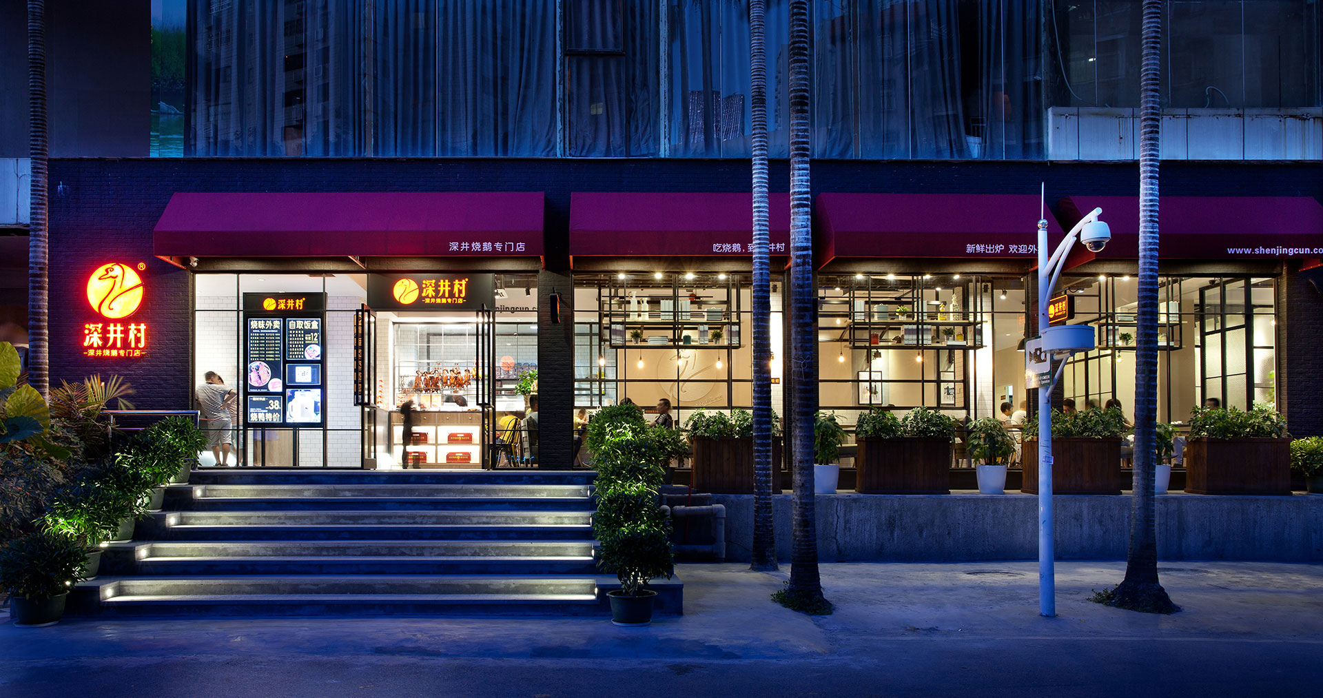 關鍵詞:深井村西湖店餐廳,深井村連鎖餐廳,外觀設計,工業風設計,廚房設計,包房設計,餐廳設計,朗昇設計