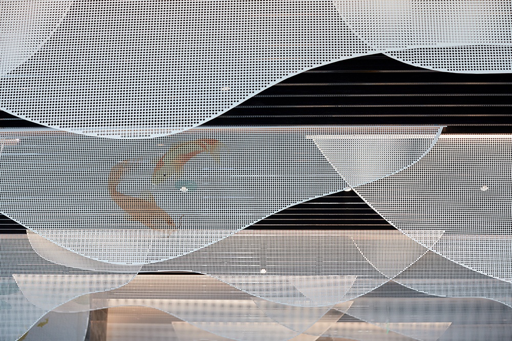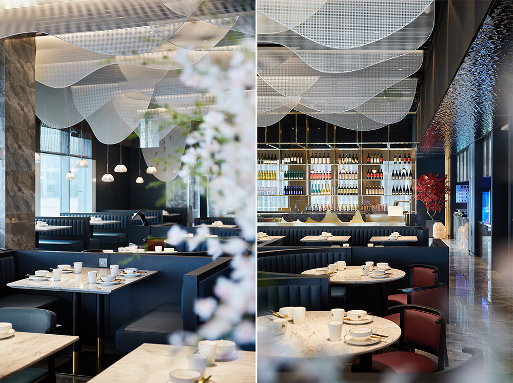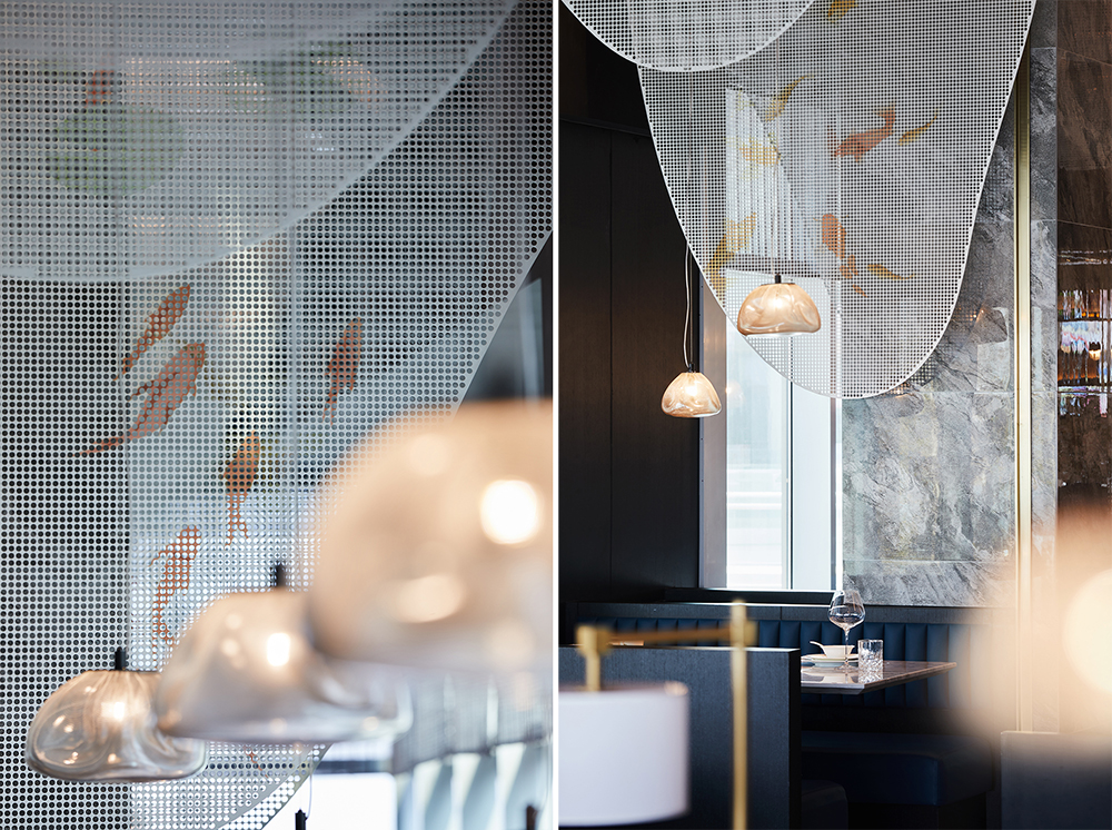 ? ? ? ??以食材為靈感的原鄉(xiāng),魚米意像看似不經(jīng)意地具化在空間里。門頭兩側(cè)有波紋造型隱藏其中,若隱若現(xiàn)卻又恰當(dāng)點(diǎn)題;前廳一對晶瑩靈動的游魚在進(jìn)門處自由奪目,迫不及待地將我們引入活色生鮮的味蕾之旅;湖色盡收眼底的大廳,頂部恣意垂下的金屬造型裝飾,仿若魚戲煙波,又如山水遠(yuǎn)闊。