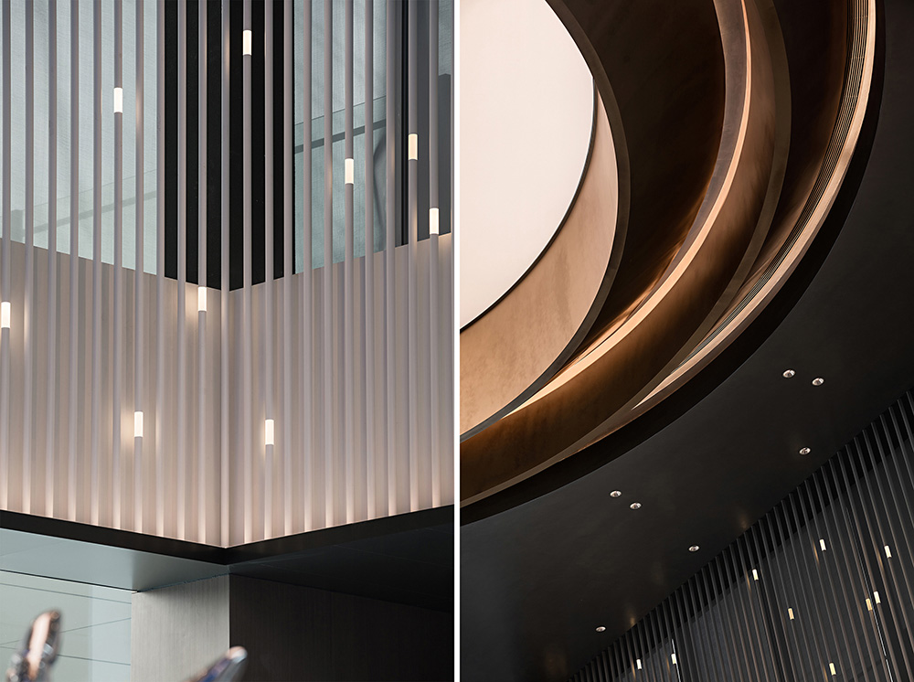 旋轉樓梯盡頭,一幅現代材料雕琢的幾何畫面浮現眼前,你在行走時抬頭仰望,未來建筑的科技之美徐徐而來。