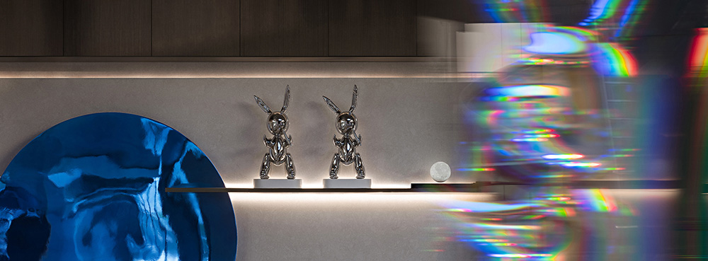 科技感的兔子公仔與墻面月亮裝飾交替呼應在空間中,仿佛來自2046的機器人用另一個星球的語言再現童年時嫦娥奔月的傳說。