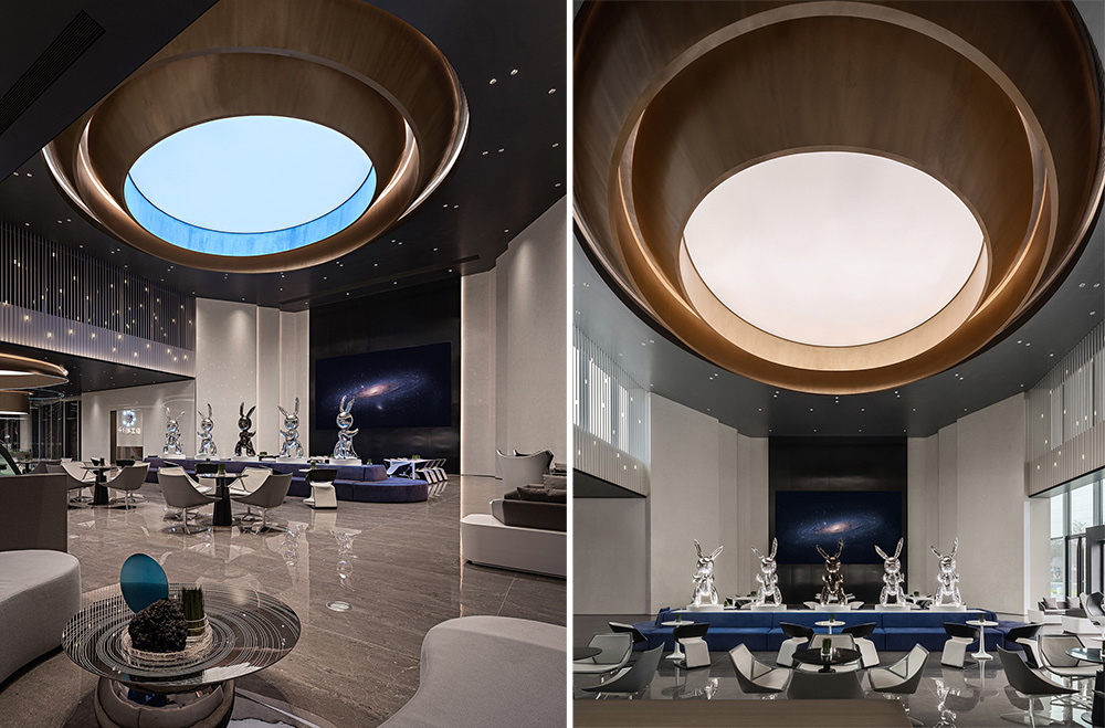 以點繪圓、思想延伸,是這個項目在理念和故事上的共性,基于手游、電競蔚藍科技的想象,室內團隊以星為象的宇宙空間概念引發建筑園林景觀設計的連續性思維,在未來科技主題中還原一個和諧共生的宇宙家園成為這片領域的共同夢想,室內展示空間是這片未來家園的縮影。