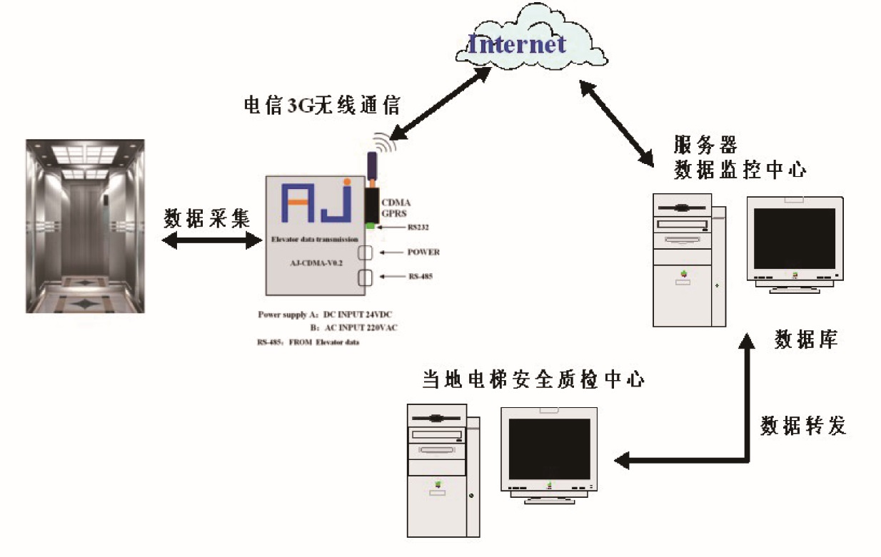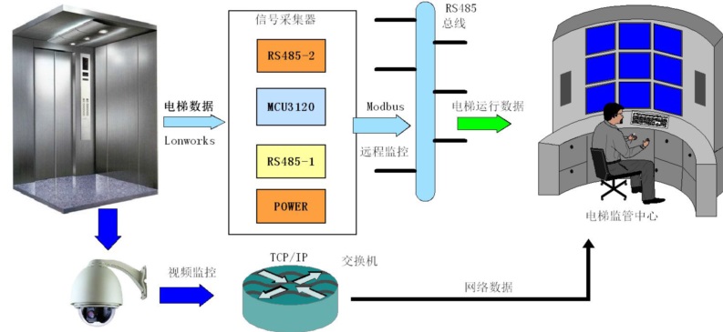 物聯(lián)網(wǎng)監(jiān)控系統(tǒng)通過特制的感應(yīng)器,采集電梯運(yùn)行相關(guān)數(shù)據(jù),通過微處理器進(jìn)行非常態(tài)數(shù)據(jù)分析,經(jīng)由3G、GPRS、以太網(wǎng)絡(luò)或者RS485等方式進(jìn)行數(shù)據(jù)傳輸,由服務(wù)器進(jìn)行綜合處理,實(shí)現(xiàn)電梯故障報(bào)警、困人救援、日常管理、質(zhì)量評(píng)估、隱患防范、多媒體傳輸?shù)裙δ艿木C合性電梯管理平臺(tái)。