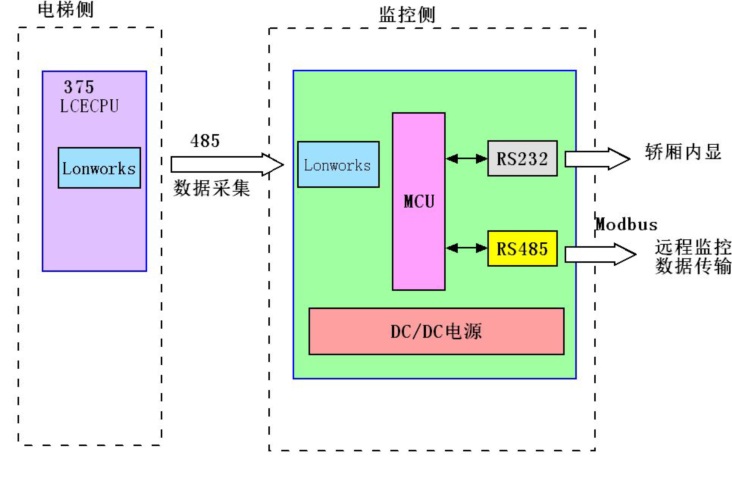 說明:如圖二所示,為BA-F電梯監(jiān)控?cái)?shù)據(jù)采集功能框圖,BA-F監(jiān)控板依據(jù)Lonworks協(xié)議獲取電梯運(yùn)行數(shù)據(jù)及故障信息,后通過RS485 Modbus RTU協(xié)議將數(shù)據(jù)輸出給監(jiān)控平臺(tái)。
