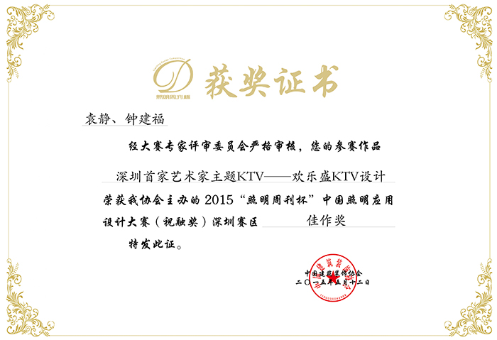 ??2015年5月12日,由中國建筑裝飾協會、中國建筑裝飾研究院主辦,青藤網、照明周刊協辦的第七屆“照明周刊杯”中國照明應用設計大賽(祝融獎)深圳賽區頒獎典禮在深圳京基晶都酒店盛大舉行。朗升國際商業設計參賽作品“深圳首家藝術家主題KTV——歡樂盛KTV設計”榮獲本次大賽深圳賽區佳作獎。