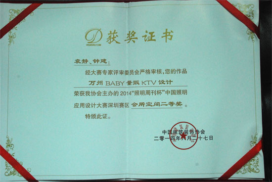 ? ? ? ?2014年6月27日, 第六屆‘照明周刊杯’中國照明應用設計大賽深圳賽區頒獎典禮在藝嘉國際大酒店華麗落幕。該活動由中國建筑裝飾與照明設計師聯盟、中國建筑裝飾協會聯合主辦,旨在發揚“普及照明設計知識、推動照明設計發展”的精神。朗昇國際商業設計憑借萬州Baby量販KTV設計作品在此次大賽喜獲會所空間設計二等獎。