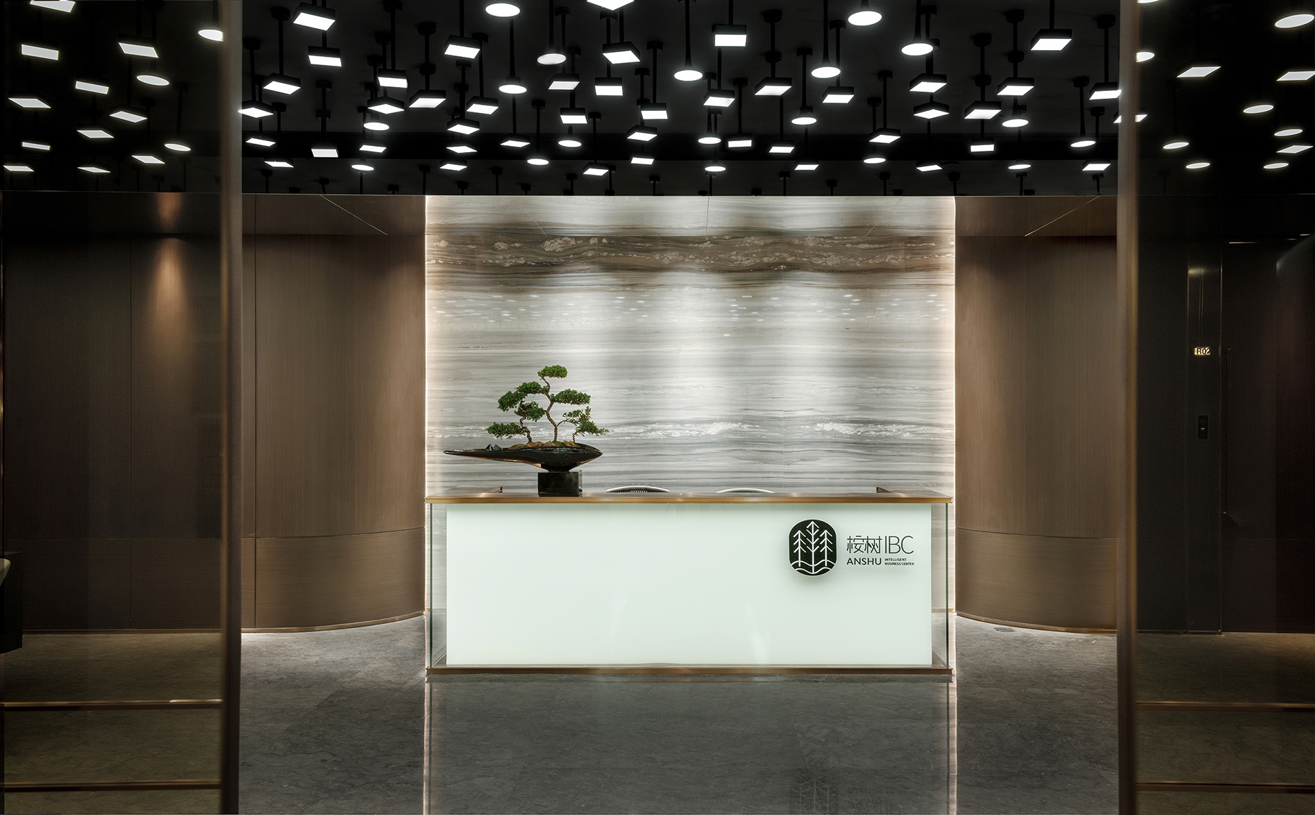 前廳空間意念由接待臺LOGO標識的水、木之形開始,延伸至水波紋形狀的石材背景墻,頂面寓意星空未來感的燈飾點綴在智慧城市的暢想中,共同構筑一個融于自然的人性化科技美學空間。