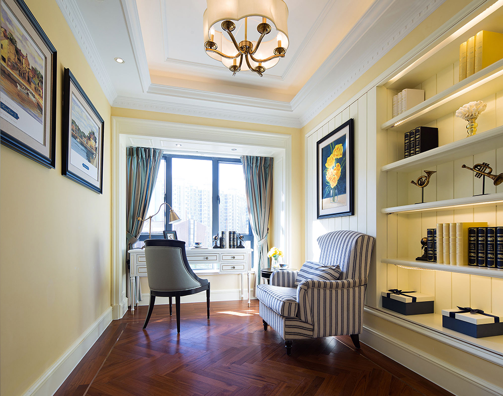 本套樣板房設計以歐式田園風格設計為主,與現代元素相結合,并輔以少量東方元素作為點綴,整體空間以藍、黃色作為色彩基調,使用優雅的黑、白色中和,浪漫的歐式經典藍、黃色絲質布藝與抽象紋樣地毯、掛畫、燈具相搭配,營造了精致細膩而又自由浪漫的空間格調,呈現出充滿自然氣息的田園風情。