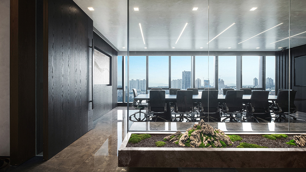 于是我們會看到黑白灰的現(xiàn)代空間里有木雕、中國紅等東方元素,大理石裝飾臺上出乎意料的山石翠綠,東方文化是我們的藝術(shù)啟蒙,是刻在骨子里的基因,無論時代帶給我們多少新的血液,我們都不能完全變成另一個自己。具有東方文化基調(diào)的現(xiàn)代空間,是朗昇這幾年所思考的設(shè)計觀念,并且在新辦公空間里得到更加真實的認證。