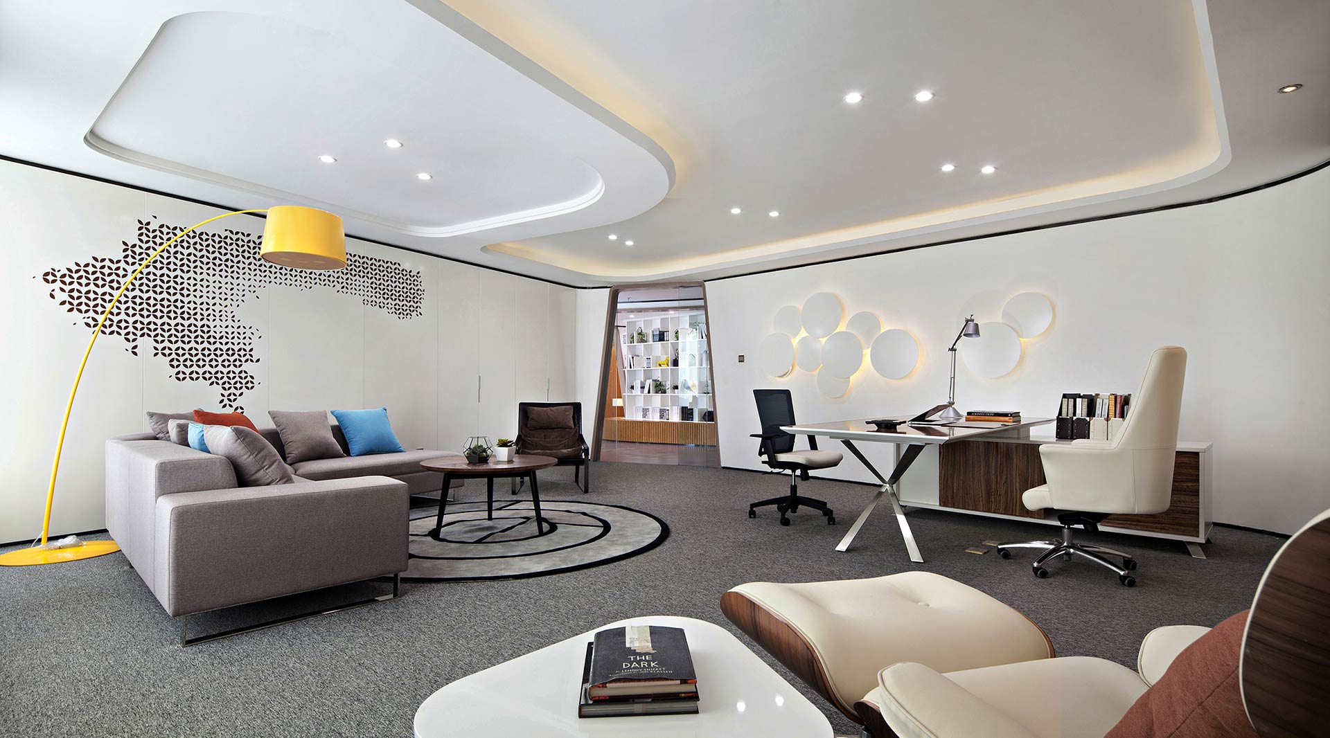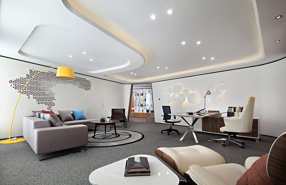 從前廳到總經(jīng)理辦公室,異形門與流動(dòng)曲線的不斷出現(xiàn),充滿著動(dòng)感和趣味,使人如同置身在一個(gè)動(dòng)態(tài)的異形空間里。素凈的白色,簡雅而高品質(zhì)的家具,讓總經(jīng)理辦公室顯現(xiàn)出一種干凈利落之美。圓形的黑白色地毯就像一幅太極八卦圖,將乾坤萬物玩轉(zhuǎn)于掌心。與地毯相對(duì)的是變異的方形天花設(shè)計(jì),扭轉(zhuǎn)了古人“天圓地方”的思想,彰顯出一種顛覆與革新的精神。鮮黃色的落地?zé)魹檎麄€(gè)凈白空間注入了一抹亮色,增添了幾分艷麗與雅趣,讓剛與柔、力與美在此處盡情釋放。