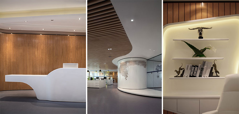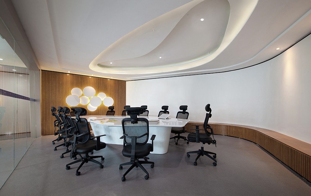 流線型的有機(jī)形態(tài)、簡潔素雅的色調(diào)、造型獨(dú)特的桌椅,甫一開始,前廳設(shè)計(jì)就奠定了整個(gè)辦公空間設(shè)計(jì)的基調(diào),給人簡約靈動(dòng)、時(shí)尚大氣的整體感受。流體曲線結(jié)構(gòu)的接待臺(tái)以象牙白作為色調(diào),皎潔如玉,純凈雅致,配以前臺(tái)人員的笑容,使人如沐春風(fēng)。接待臺(tái)后側(cè)豎條狀的木質(zhì)裝飾墻,宛若一排整齊的琴鍵,彈奏著氣勢恢宏的交響曲,又似一卷綿長的書卷,正展開新的篇章。右側(cè)是訪客接待區(qū),一組特別配置的純色U形布藝沙發(fā),溫柔了每一縷風(fēng)塵,給人輕松愜意之感。